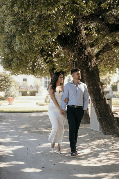 Modern, Editorial Engagement shoot at Vizcaya Museum and Gardens in Miami, FL. Sun, Fun and Italian Vibes during their engagement shoot which would then lead them to getting married in Brazil.